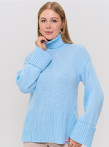 Джемпер женский из трикотажной хлопковой ткани (двунитка). По переду джемпера расположены декоративные элементы. Спущенное плечо, рукав 3/4. Низ рукава обработан манжетой. Вырез горловины круглый, оформлен бейкой.