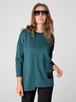 Джемпер женский, прямого силуэта с длинным рукавом. Рукав покроя реглан с отрезной манжетой по низу. Горловина круглой формы, с подрезной бейкой. Перед джемпера задекорирован небольшой вышивкой. Спинка без особенностей.
