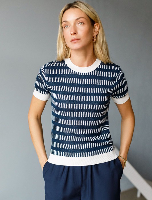 Состав: 65%ПЭ 35%Вис Плотность: 328 GGТоп тонкой вязки выполнен из полиэстера с добавлением вискозы. Вертикальный вывязанный принт визуально стройнит и вытягивает силуэт. Добавление в состав ПЭ способствует легкости и износостойкости изделия. Мягкая пряжа приятно ощущается на теле и дарит настоящий комфорт в теплое время года. Хорошо сочетается с белыми и синими низами поддерживая морской стиль