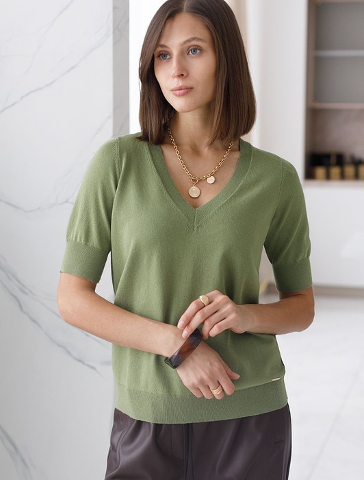 Состав: 83%Вис 17%ПА Плотность: 12 GG Параметры модели на первом фото: Рост 170, бюст 83, талия 64, бедра 88 Размер товара на первом фото: 42Джемпер тонкой вязки выполнен из вискозы с нейлоном. Модель с V-вырезом свободного силуэта. Мягкая очень приятная к коже пряжа не колется, хорошо держит форму и гарантирует комфорт во время носки в течение всего дня. Изделие дополнено фирменным металлическим логотипом бренда.