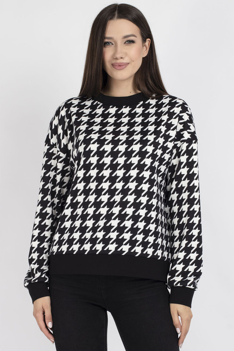Дизайн этого джемпера особенно привлекателен благодаря принту в виде гусиной лапки. Этот оригинальный принт добавляет особый шарм и индивидуальность вашему образу.