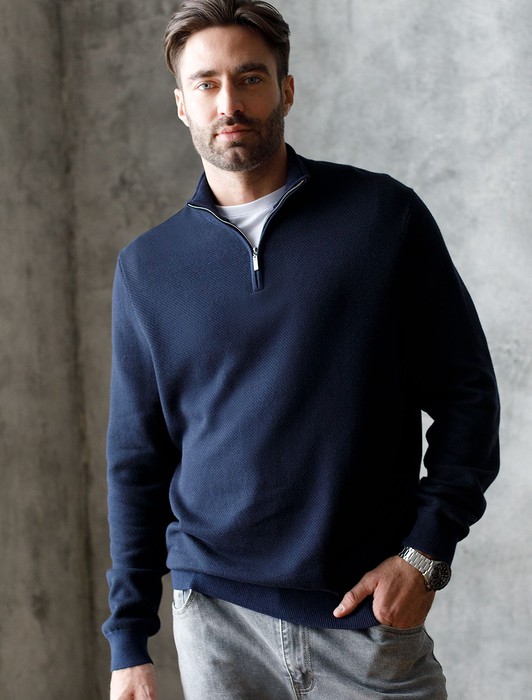 Состав: 55%Хлопок 45%ПАН (акрил)Темно-синий джемпер с длинными рукавами выполнен из мягкой хлопковой пряжи с добавлением акрила. Высокий воротник застегивается молнией. За счет переплетения светлых и темных нитей получилась фактурная меланжевая модель, которая, отлично держит тепло и почти не ощущается на теле. Сочетается с футболками, денимом и с чиносами, любой обувью.