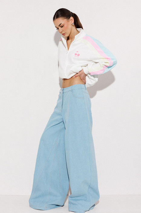 Брюки-джинсы, расклешенные к низу. На притачном поясе со шлёвками, застежкой-гульфик. Пояс застегивается на петлю-пуговицу. По переду карманы. Спинка с кокеткой и накладными карманами. По шаговому шву клин из основной ткани, переходящий на перед и спинку.