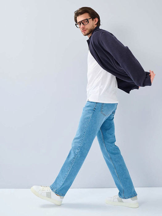 Мужские классические джинсы с пятью карманами. Посадка Regular fit (полуоблегающие по бедру), средняя высота талии. Застежка на молнии. Немного зауженные к низу. Выполнены из слабоэластичной ткани denim comfort stretch. Средняя стирка с  потёртостями и "усами" спереди и потёртостями сзади. Параметры указаны для размера 32.Длина внутреннего шва  - 85,0 см.