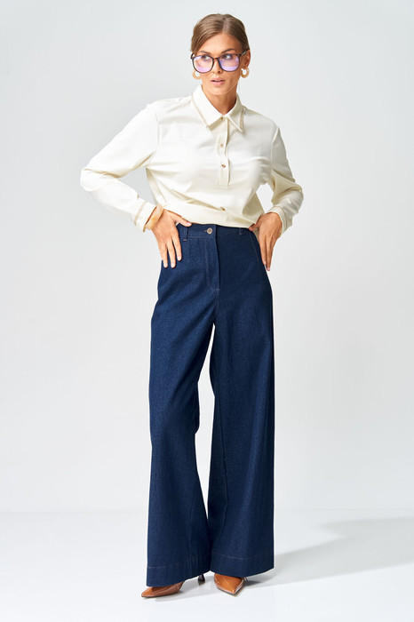 Брюки расширеные книзу на притачном поясе из джинсовой хлопковой ткани. По поясу настрочены шлевки. По передним и задним частям брюк вытачки. На задних частях брюк настрочены карманы. Карманы, вытачки, пояс, низ брюк отделаны отделочной строчкой. Длина брюк с учетом пояса - 109 см. Данная модель прекрасно сочетается с другими моделями из нашей коллекции 15409, 15377, 15408/1, 15368. Создайте гармоничный образ, комбинируя эти изделия!