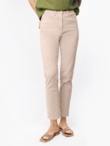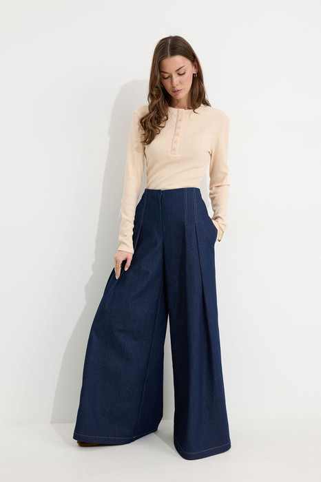 Брюки-палаццо из хлопкового денима. Посадка до линии талии, с расширением от линии бедра. Без пояса, верхний срез обтачной. На передних половинах брюк по две складки, застрочены на 15 см от верха. По переду застежка на молнию по типу гульфик, а также на пришивную потайную кнопку и потайную пуговицу. На задних половинах брюк по две вытачки. Карманы в боковых швах. По боковым швам, входам карманов, складкам по переду, по подгибке низа проложены двойные отделочные строчки контрастного цвета.