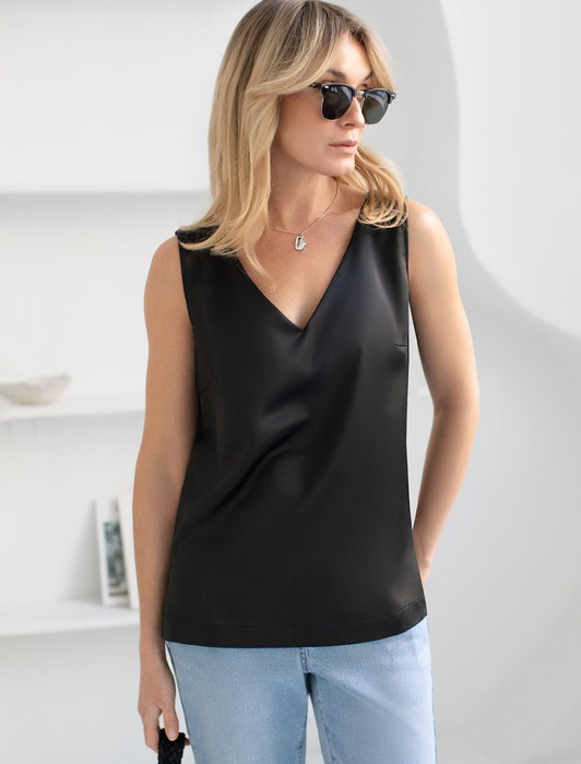 Этот топ идеально подойдет для создания стильного ансамбля на вечерние мероприятия или важные события. Благодаря сочетанию элегантности и практичности, такая стильная блузка без рукавов станет незаменимой частью гардероба для женщин, которые ценят качество и комфорт в одежде. Благородный блеск сатина добавляет нотку роскоши в повседневный гардероб и гармонично сочетается с разными стилями одежды: офисными брюками, джинсами или юбками. V-образный вырез визуально вытягивает шею и создает элегантный акцент в зоне декольте, делая образ более открытым и современным.