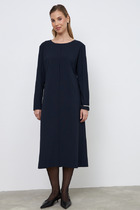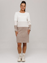 Платье женское, приталенного силуэта, длиной миди из легкой костюмно-плательной ткани. Платье отрезное по линии талии. Для лучшего прилегания по талии собрано на венгерку. В боковых швах функциональные карманы. Рукав длиной до локтя, окат собран на эластичную ленту, рукав заканчивается притачной манжетой завязывающейся на бант.
