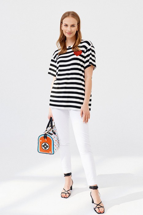 Брюки женские, зауженные к низу, из джинсовой ткани. Передние половинки брюк с функциональными карманами с подрезным бочком. Застежка брюк на тесьму-молнию и петлю, пуговицу. Верхний срез обработан притачным поясом, частично на резинке. На поясе имеются шлевки.