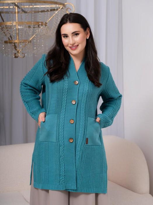 Совместные закупки Екатеринбург Женская одежда Кофты, кардиганы — ESENIA Кардиган женский полушерстяной удлиненный с косами - Морская волна