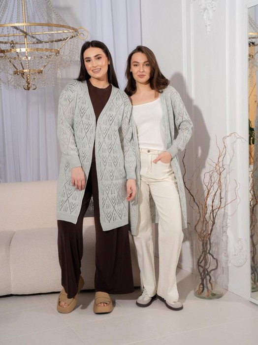 Совместные закупки Екатеринбург Женская одежда Кофты, кардиганы — ESENIA Кардиган женский удлиненный Ажур 2 - Светло-Серый