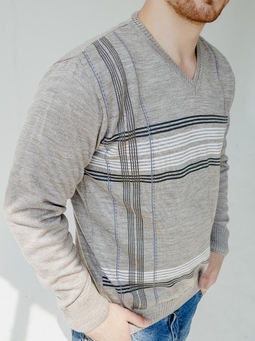 ESENIA Свитер мужской полушерстяной с воротом мыс - Светло-серый