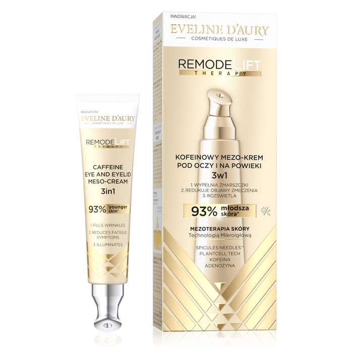 Мезо-крем RemodeLIFT THERAPY для кожи вокруг глаз с кофеином 3-в-1 — это передовой уход для кожи вокруг глаз, созданный на основе технологии микроигольной мезотерапии. 24 750 микроигл Spicules Needles™ в составе крема глубоко проникают в эпидермис, доставляя концентрированные активные ингредиенты, которые эффективно разглаживают, осветляют и уменьшают признаки усталости. Мягкая, но в то же время усовершенствованная формула крема питает нежную кожу вокруг глаз, придавая ей молодой и отдохнувший вид. Его легкая консистенция быстро впитывается, не утяжеляя кожу.