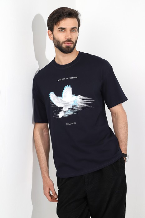 Футболка мужская из гладкокрашеного трикотажного полотна "кулирка", свободного покроя, со спущенным плечом и втачными короткими рукавами. Горловина овальной формы обработана втачной планкой. По шву втачивания планки настрочена двойная отделочная строчка. В центре переда - принт, выплненный в технике шелкографии.