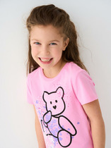 Детская футболка для девочки. Модель прямого кроя, выполнена из эластичного хлопкового трикотажа джерси. Красочный принт с милым мишкой. Горловина круглая.