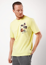 Футболка прямого силуэта, украшена печатью . Горловина декорирована треугольным вырезом со вставкой, украшена  пуговицами.