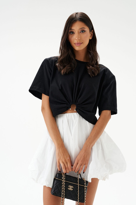 Футболка прямого кроя, выполнена из хлопкового полотна черного цвета. Характеристика: укороченая, прямой свободный крой, горловина овальная, рукав слегка спущен, подплечники, спереди декоративная сборка на элемент-полукольцо . Длина по центру спинки от края горловины 40 см, длина рукава от края горловины 39 см.