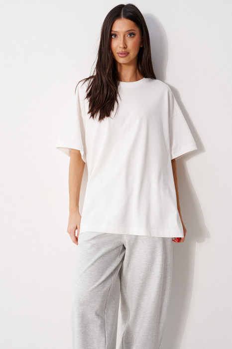 Футболка прямого свободного кроя, выполнена из трикотажного полотна белого цвета. Характеристика: прямой крой, овальная горловина выполнена из довяза, рукав вточной спущенный, край выполнен из довяза, спинка цельнокраеная, на спинке под горловиной брендированная нашивка "ANNETE". Длина по спинке 68см, длина рукава от края горловины 40см.