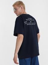Мужская футболка из кулирки. Окантовка горловины и рукавов другим цветом, короткие рукава, округлая горловина, принт в виде надписей, две расцветки — белая и индиго. Размеры от 48 до 56. Имеется возможность заказать товар в розницу.