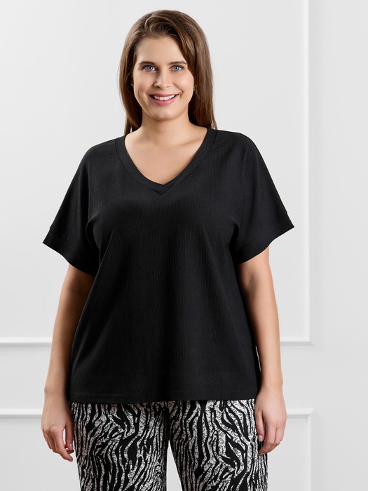 Футболка женская из гладкокрашенного трикотажного полотна «бурумчук» (шелковый креп), прямого кроя, с углубленным V-образным вырезом горловины, обработанным втачными планками, заходящими друг на друга спереди. Короткие цельнокроеные рукава с притачными манжетами.
