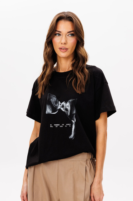 Базовые футболки - это конечно хорошо, но что делать, если хочется привнести в образ яркости, иронии и немного артистизма? Лучший способ выразить себя - выбрать вариант с классным говорящим принтом. Футболка классического кроя с втачным рукавом. Длина футболки около 60 см. Длина рукава около 15 см.