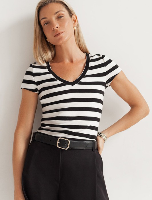 Состав: 95%Хлопок 5%ПУ Плотность: 210 Г/м2Облегающая футболка с V-образным вырезом в черно-белую полоску создаст утонченный образ. Идеальная базовая модель для вашего гардероба! Глубокий V-образный вырез подчеркивает линию шеи и зрительно удлиняет силуэт. Футболка выполнена из хлопка с добавлением эластана, которая мягко облегает контуры тела, подчеркивая достоинства фигуры. Универсальный вариант для создания стильных повседневных образов.