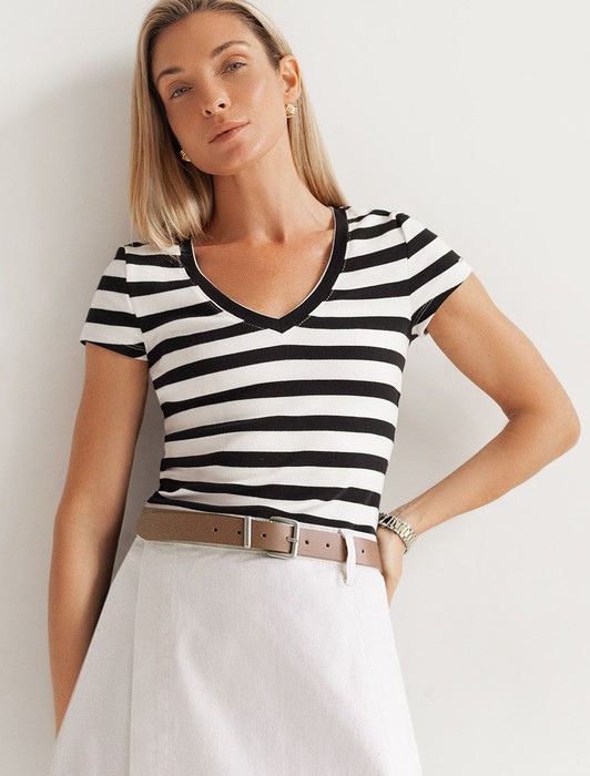 Состав: 95%Хлопок 5%ПУ Плотность: 210 Г/м2Облегающая футболка с V-образным вырезом в черно-белую полоску создаст утонченный образ. Идеальная базовая модель для вашего гардероба! Глубокий V-образный вырез подчеркивает линию шеи и зрительно удлиняет силуэт. Футболка выполнена из хлопка с добавлением эластана, которая мягко облегает контуры тела, подчеркивая достоинства фигуры. Универсальный вариант для создания стильных повседневных образов.