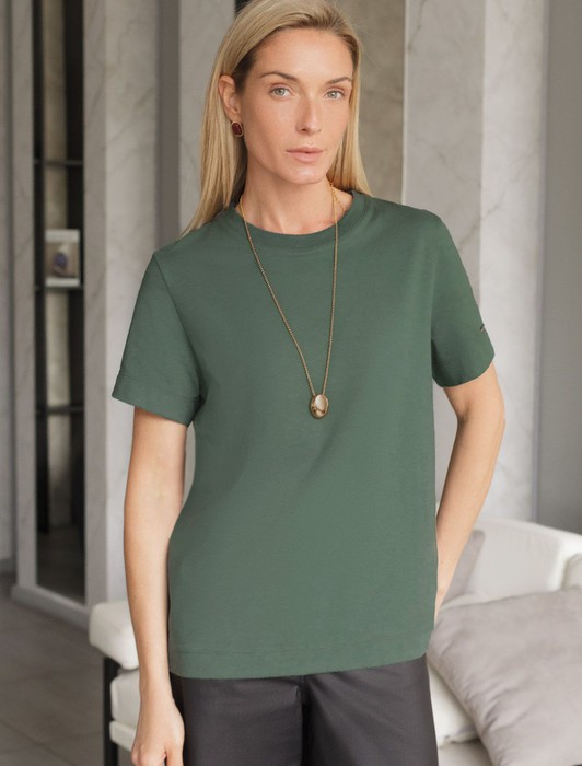 Состав: 92%Хлопок 8%ПУ Плотность: 170 Г/м2 Параметры модели на первом фото: Рост 172, бюст 88, талия 64, бедра 88Базовая однотонная футболка из премиального хлопка. Горловина выполнена из рибаны в тон изделия, Добавление эластана в состав изделия способствует формоустойчивости. Самое высокое качество хлопковых волокон обеспечивает комфорт в любое время года. Идеально держит форму и сохраняет внешний вид в течение долговременного использования. Универсальная базовая вещь для ваших стилистических решений. Изделие дополнено металлическим логотипом бренда на рукаве.