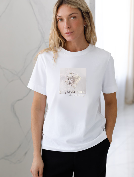 Футболка выполнена из премиального хлопка. Авторский принт нанесен фактурными красками и фольгой с устойчивым покрытием. Наличие эластана в составе гарантирует комфорт и формоустойчивость. Принт станет дополнением не только в повседневных сочетаниях, но и отлично подойдет к вечерним образам. Изделие дополнено фирменным металлическим логотипом бренда.