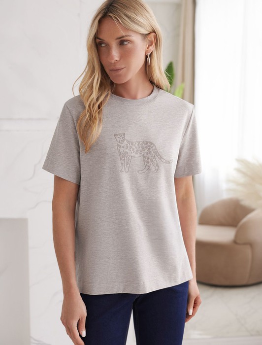 Состав: 92%Хлопок 8%ПУ Плотность: 170 Г/м2Футболка выполнена из премиального хлопка.Принт "леопард" нанесен фактурными красками с устойчивым покрытием. Наличие эластана в составе гарантирует комфорт и формоустойчивость. Изделие дополнено фирменным металлическим логотипом бренда.