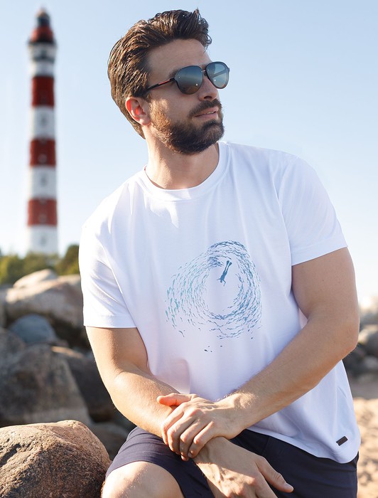 Состав: 92%Хлопок 8%ПУ Плотность: 170 Г/м2 Параметры модели на первом фото: Рост 190, бюст 108, талия 87, бедра 104Футболка выполнена из премиального хлопка с эластаном. Авторский принт нанесен фактурными красками с устойчивым покрытием. Изделие комфортно сидит по фигуре, не сковывая движений. За счет среднего объема, хорошо подойдет как первый слой под пиджак, кардиган или бомбер. На рукаве нашивка из эко-кожи с логотипом бренда.