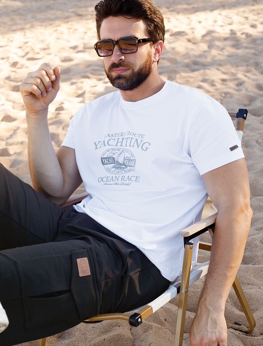 Состав: 92%Хлопок 8%ПУ Плотность: 170 Г/м2 Параметры модели на первом фото: Рост 190, бюст 108, талия 87, бедра 104Перевод принта: Eastern route yachting, sailing racing challenge, east coast 1982, yacht club, offshore trans atlantic regatta, ocean race, round the world - заплыв на яхте по восточному маршруту, соревнование мореплавателей, яхт-клуб, трансатлантическая регата, гонка вокруг света. Футболка выполнена из премиального хлопка с эластаном. Авторский принт нанесен фактурными красками с устойчивым покрытием. Изделие комфортно сидит по фигуре, не сковывая движений. За счет среднего объема, хорошо подойдет как первый слой под пиджак, кардиган или бомбер. На рукаве нашивка из эко-кожи с логотипом бренда.