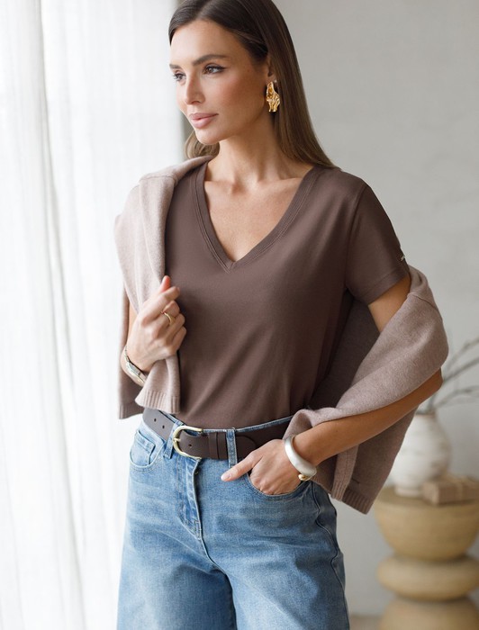 Состав: 92%Хлопок 8%ПУ Плотность: 170 Г/м2Однотонная футболка с V-образным вырезом выполнена из премиального хлопка. Добавление эластана в состав изделия способствует формоустойчивости. Самое высокое качество длинноволокнистых хлопковых волокон обеспечивает комфорт в любое время года.Универсальная базовая будет уместна не только в повседневном образе с денимом, но и в офисе с нестрогим дресс-кодом, в паре с брюками и жакетом.