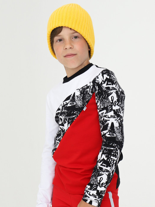 Лонгслив для мальчика прямого силуэта, средней длины, с длинными втачными рукавами, с круглым вырезом горловины. Полочка разрезная, все детали лонгслива выполнены из полотен коипаньонов. В качестве дополнительного декора использованы брендовые этикетки и флажки.