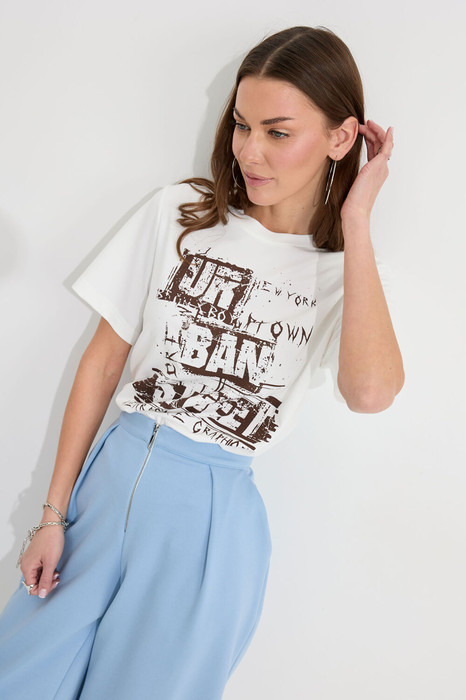 Джемпер полуприлегающего силуэта из трикотажного полотна. Горловина округлая. Рукав втачной короткий. По переду дизайнерский принт.