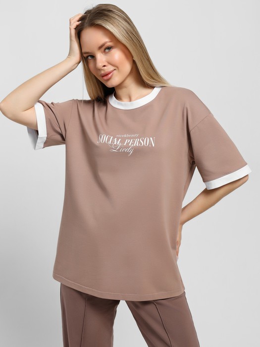 Футболка молодежная из трикотажного полотна «кулирка с лайкрой» свободного покроя, горловиной овальной формы, короткими втачными рукавами. Планка горловины и манжеты на рукавах выполнены из контрастного материала, на полочке принт, выполненный в технике «шелкографии».
