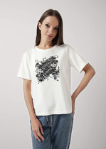 Футболка женская из гладкокрашенного трикотажного полотна «кулирка с лайкрой», свободного покроя, со спущенным плечом и втачными рукавами длиной до локтя, горловиной овальной формы, обработанной втачной планкой. По центру полочки выполнена вышивка «пайетками» в тон изделия. В нижней части боковых швов небольшие разрезы.