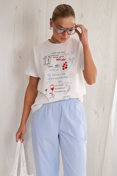 Футболка прямого кроя, выполнена из плотного трикотажного полотна (интерлок) Немного спущенная линия плеча. Короткий рукав. Горловина круглая с притачной планкой. Дизайнерский авторский принт на полочке изделия.