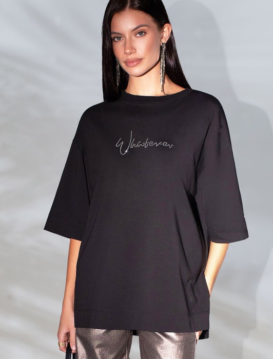 Состав: 92%Хлопок 8%ПУ Плотность: 170 Г/м2Оверсайз футболка черного цвета из премиального хлопка с добавлением эластана создана для комфорта и стиля каждый день. Натуральный материал приятный к телу, дышащая ткань хорошо держит форму и подходит для повседневной носки дома, в офисе или на прогулке. Классический свободный крой, удлиненный прямой силуэт и свободная посадка делают эту базовую футболку универсальным решением для любой фигуры и роста, включая плюс сайз размеры и беременных девушек, отлично скроет животик. Широкие рукава держат форму и подойдут на полные руки. Нарядная футболка украшена авторским принтом в виде надписи серебристыми стразами, которые создают красивый мерцающий эффект. Перевод надписи Whatever - Что бы ни... Такой акцент делает модель уместной как для особых случаев, так и для ежедневных образов.