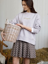 Джемпер из трикотажной хлопковой ткани, со спущенным плечом. По переду джемпера расположены декоративные элементы. Вырез горловины круглый, оформлен бейкой. Спинка без среднего шва.