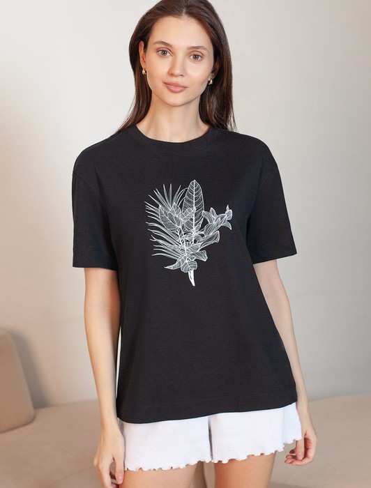 Состав: 100%Хлопок Плотность: 140 Г/м2Футболка черного цвета изготовлена из премиального 100% хлопка, благодаря чему изделие приятно прилегает к телу, не вызывает дискомфорта и идеально подходит для чувствительной кожи. Натуральный материал сохраняет форму и цвет после множества стирок, обеспечивая долговечность изделия, а его высокая воздухопроницаемость создает ощущение свежести даже в течение долгого дня. Особое внимание привлекает стильный принт контрастного цвета в виде тропических растений. Принт выполнен красками с устойчивым покрытием, который добавляет изделию оригинальности и позволяет выразить индивидуальность. Свободный крой футболки дарит удобство и не стесняет движений, что делает ее идеальной для повседневной носки или активного отдыха, подчеркивает современный взгляд на моду. Подойдет девушкам и женщинам на любую фигуру, вы будете чувствовать себя в ней уверенно и комфортно. Лаконичный современный принт делает изделие универсальным: можно создавать стильные образы для прогулок, встреч, занятий спортом и домашних дел. Базовая футболка подходит для любой ситуации и сочетается с разными элементами гардероба.