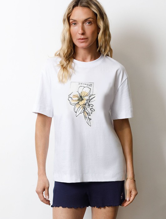 Состав: 100%Хлопок Плотность: 140 Г/м2Футболка белого цвета выполнена из премиального 100% хлопка плотностью 140 Г/м2. Главная особенность этого изделия — тонкое кулирное полотно, которое легче и воздушнее стандартного варианта. Благодаря своей деликатной текстуре футболка идеально подходит для домашних образов и пижамных комплектов. Ткань отлично дышит, обеспечивая максимальный уют во время сна и отдыха. Особое внимание привлекает стильный принт контрастного цвета в виде цветка с надписью. Перевод надписи: Be the energy you vant to attract - Будь той энергией, которую хочешь привлечь. Принт выполнен красками с устойчивым покрытием, который добавляет изделию оригинальности и позволяет выразить индивидуальность. Свободный крой футболки дарит удобство и не стесняет движений, что делает ее идеальной для повседневной носки или активного отдыха, подчеркивает современный взгляд на моду. Подойдет девушкам и женщинам на любую фигуру, вы будете чувствовать себя в ней уверенно и комфортно. Лаконичный современный принт делает изделие универсальным: можно создавать стильные образы для прогулок, встреч, занятий спортом и домашних дел. Базовая футболка подходит для любой ситуации и сочетается с разными элементами гардероба.