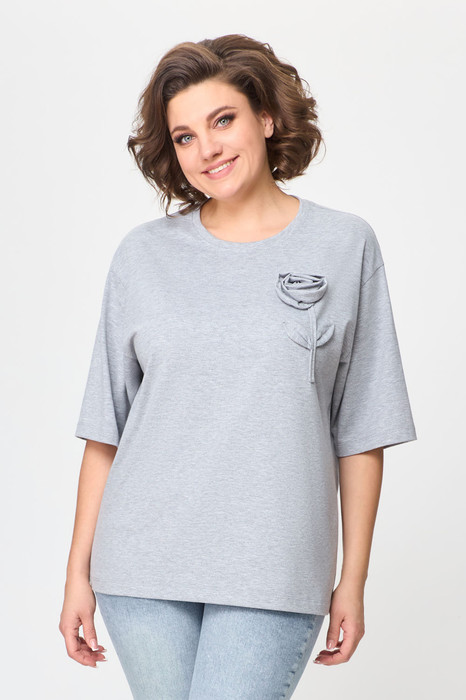 Джемпер прямого силуэта с втачным спущенным рукавом. По левой части переда объемный цветок в тон. Горловина обработана бейкой. Низ футболки и рукавов обработаны на плоскошовной машине. Шов втачивания горловины с отсрочкой.