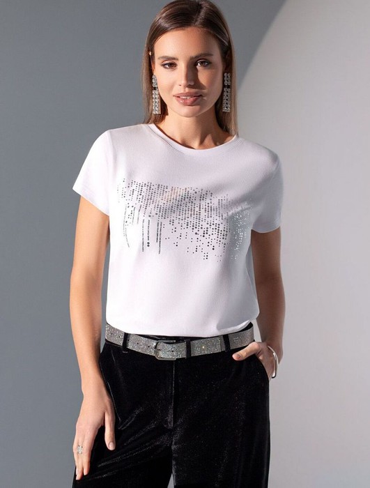 Эта эффектная футболка станет отличным выбором на праздник, подчеркивая образ сияющей и уверенной в себе девушки или женщины. Если вы ищете комфортный и одновременно привлекательный наряд для особых моментов, эта