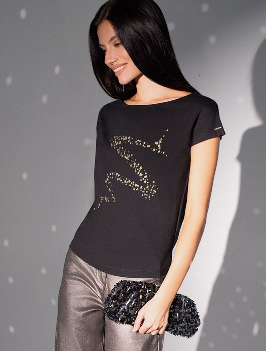 Эта нарядная футболка подходит для создания образа на каждый день и идеально подойдет на выход. Модель не мнется, что делает ее практичным вариантом для активных женщин, которые ценят стиль и удобство.