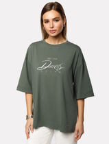 Женская футболка F5, Oversize fit (свободный силуэт), круглый вырез горловины, короткий цельнокроеный рукав. Выполнена из классического трикотажного полотна.