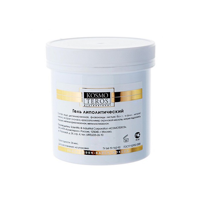 Гель липолитический от Kosmoteros - специальное средство для борьбы с избыточным весом, удаления второго подбородка, лифтинговых процедур по телу: ингибирует накопление жиров в адипоцитах, активизирует липолиз, стимулирует лимфодренаж, повышает упругость кожи. Для ионофореза или миостимуляции. Содержание флавоноидов листьев болто и кофеина ингибирует накопление жиров в адипоцитах. Экстракты лимона и ананаса активизирует липолиз, стимулирует лимфодренаж, повышает упругость кожи.