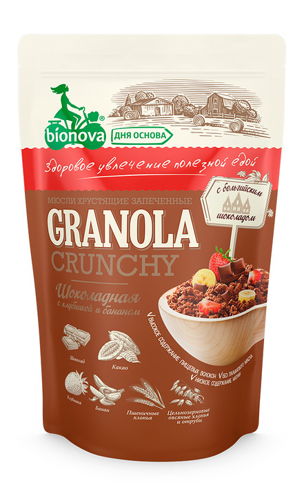 Запеченная шоколадная гранола с клубникой и бананом - ароматный, вкусный и полезный завтрак, обладающий изысканным вкусом благодаря неповторимому сочетанию темного бельгийского шоколада с кусочками клубники и банана бережной сублимационной сушки. Запеченные злаки содержат клетчатку – растительные пищевые волокна, которые нормализуют работу пищеварительной системы.