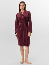 Халат на молнии, полуприлегающего силуэта, длиной выше колена, с капюшоном. Рукав втачной, короткий, с лампасами контрастного цвета. В нижней части боковых швов обработаны разрезы. На полочке боковые карманы. По низу спинки расположены лампасы контрастного цвета. На капюшоне вставка с лампасами. Край капюшона, низ рукавов и халата обработаны бейкой из полотна контрастного цвета.