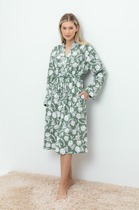 Оригинальный халат из кулирки. Дизайн в клетку, рукава отсутствуют, окантовка, планка и пояс контрастного цвета, застегивается на пуговицы, карманов нет, общая длина халата чуть выше коленей.